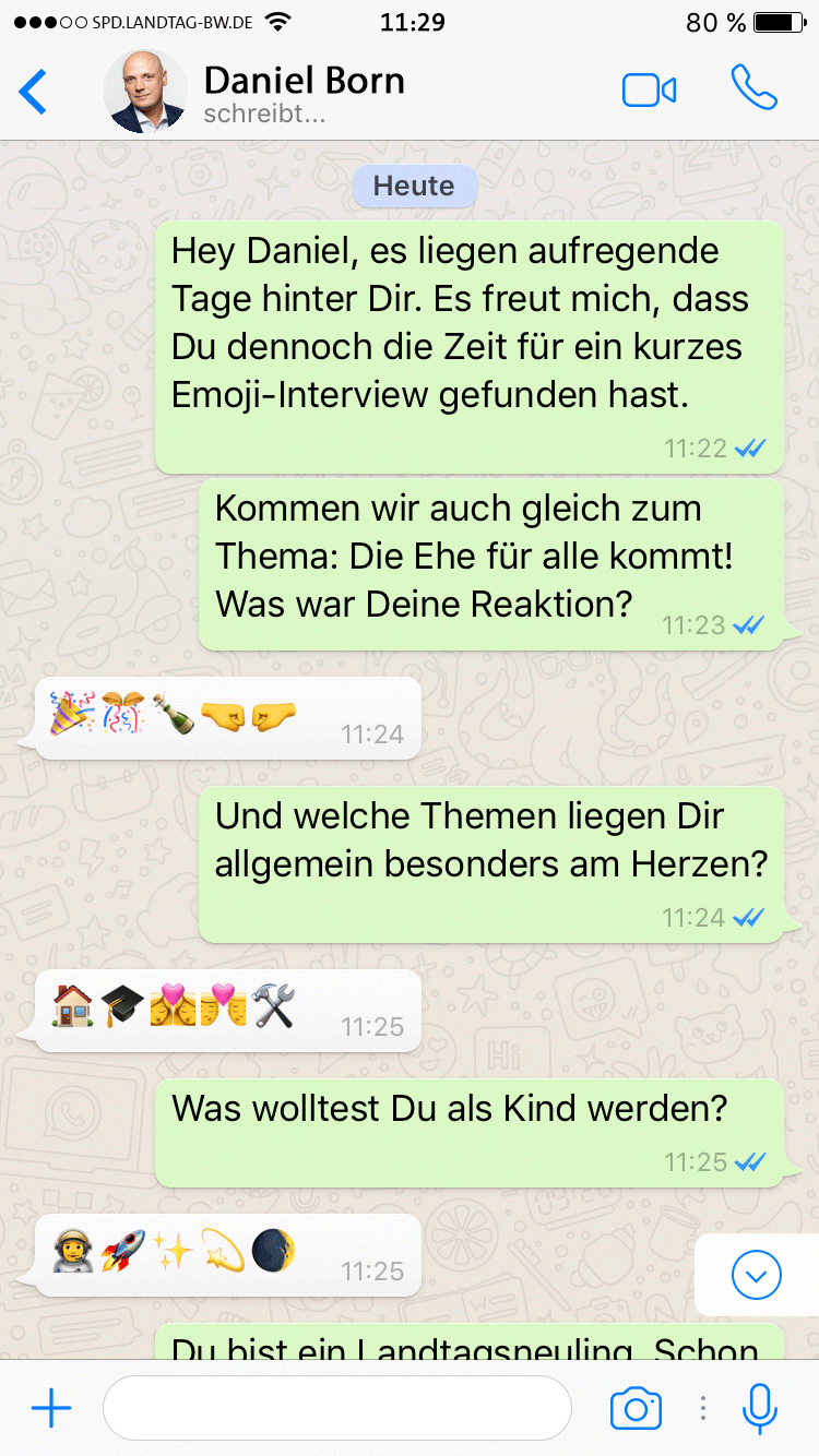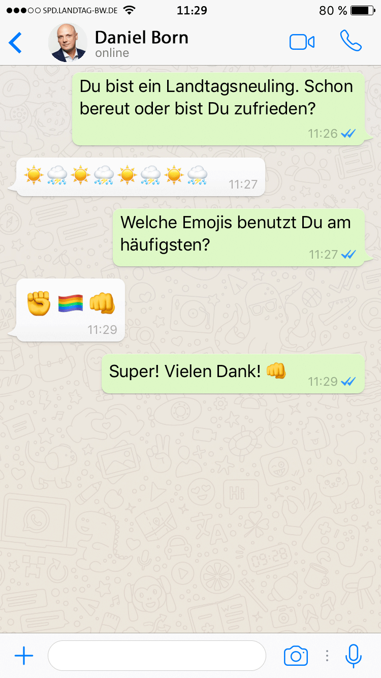 Ihr könnt mich (in der Regel) von Montag bis Freitag von 9 bis 17:30 Uhr unter der Telefonnummer 0711/2063-7101 erreichen. Meine Mail-Adresse lautet daniel.born.ma1@spd.landtag-bw.de.